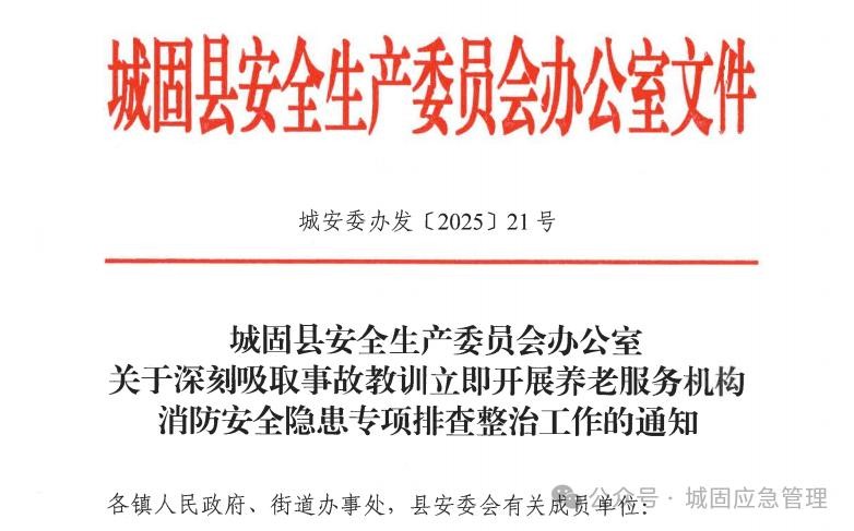 县安委办制定并印发了《关于深刻吸取事故教训立即开展养老服务机构消防安全隐患专项排查整治工作的通知》,要求民政、卫健等部门及各镇街要深刻汲取本次事故教训,以养老机构、日间照料场所、康养机构等老人、患者集中生活居住的场所为重点,全面排查辖区敬老院、康复中心、精神病院等重点场所消防安全隐患,坚决遏制群死群伤火灾事故发生。