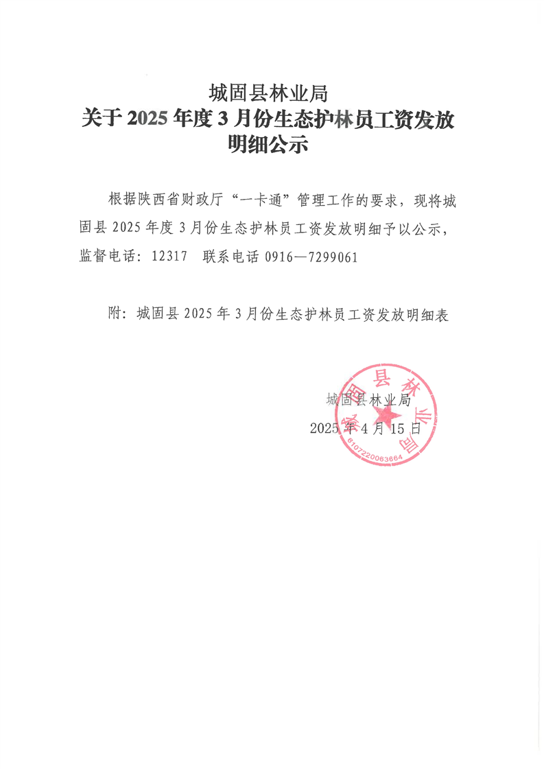城固县林业局关于2025年度3月份生态护林员工资发放明细公示