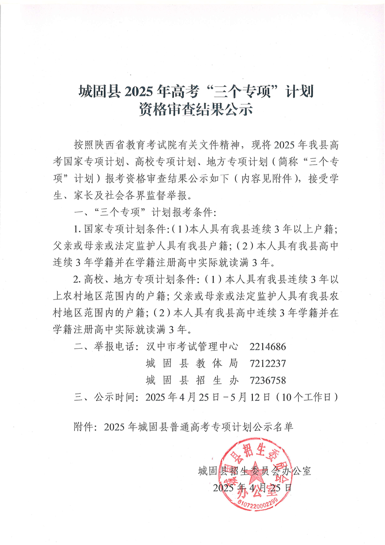 城固县2025年高考“三个专项”计划资格审查结果公示