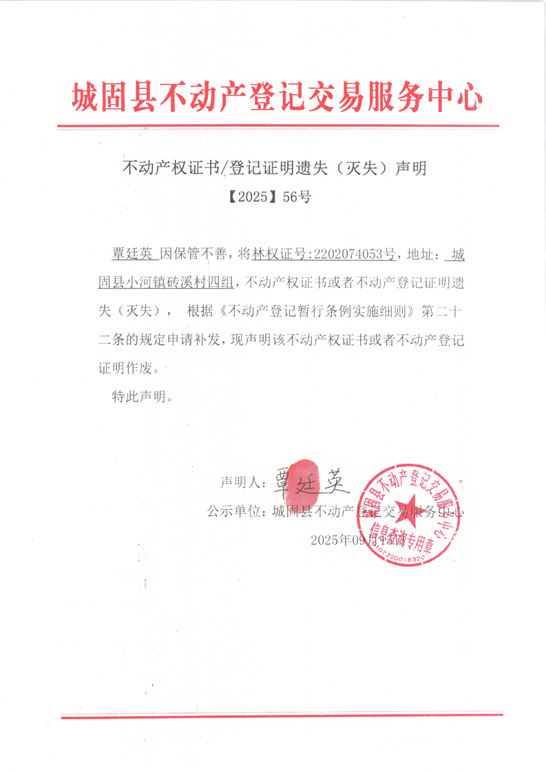 城固县不动产登记交易服务中心遗失(灭失)声明 【2025】56号